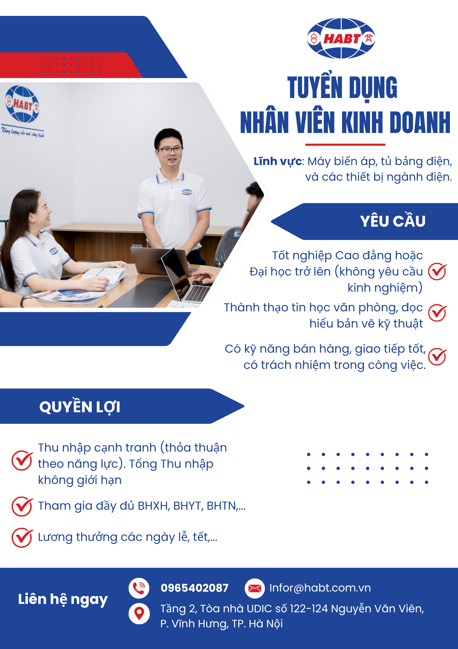 Công ty cổ phần Chế tạo thiết bị Điện và Máy biến thế HABT là doanh nghiệp chuyên hoạt động trong lĩnh vực kinh doanh sản xuất: Máy biến áp, tủ bảng điện, kinh doanh và phân phối các thiết bị ngành điện. Do nhu cầu mở rộng sản xuất và khối lượng công việc nhiều nên HABT cần tuyển dụng thêm vị trí nhân viên kinh doanh.